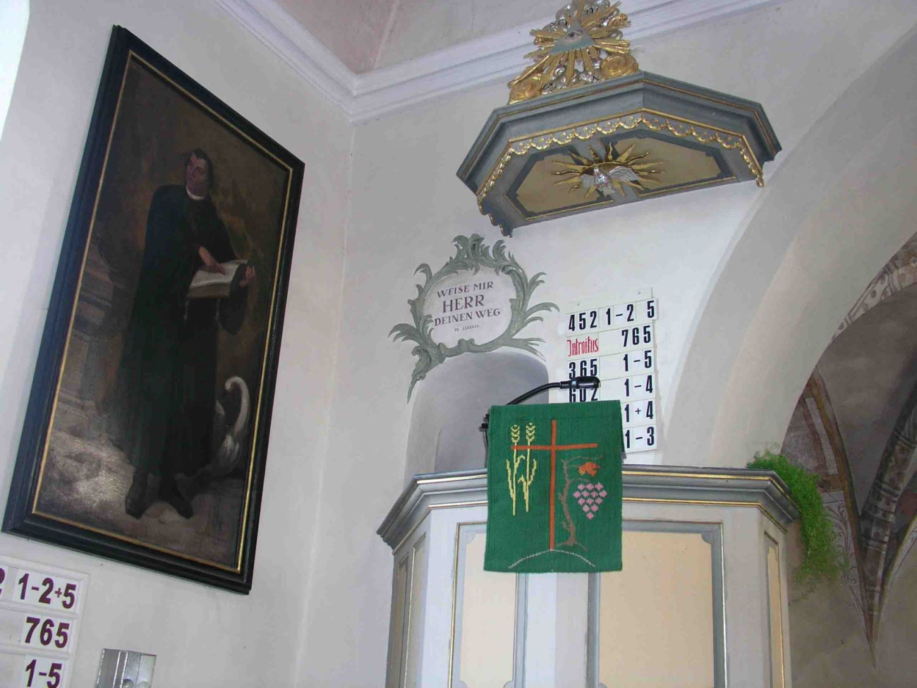Neben der Kanzel hängt ein Gemälde, das den Reformator Martin Luther zeigt.