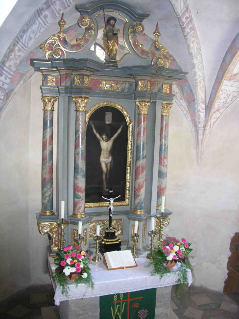 Aus der ältesten Bauphase um 1200 stammen höchstwahrscheinlich die Grundmauern des Turmes und das Chorgewölbe (Altarraum) mit den Fresken.
